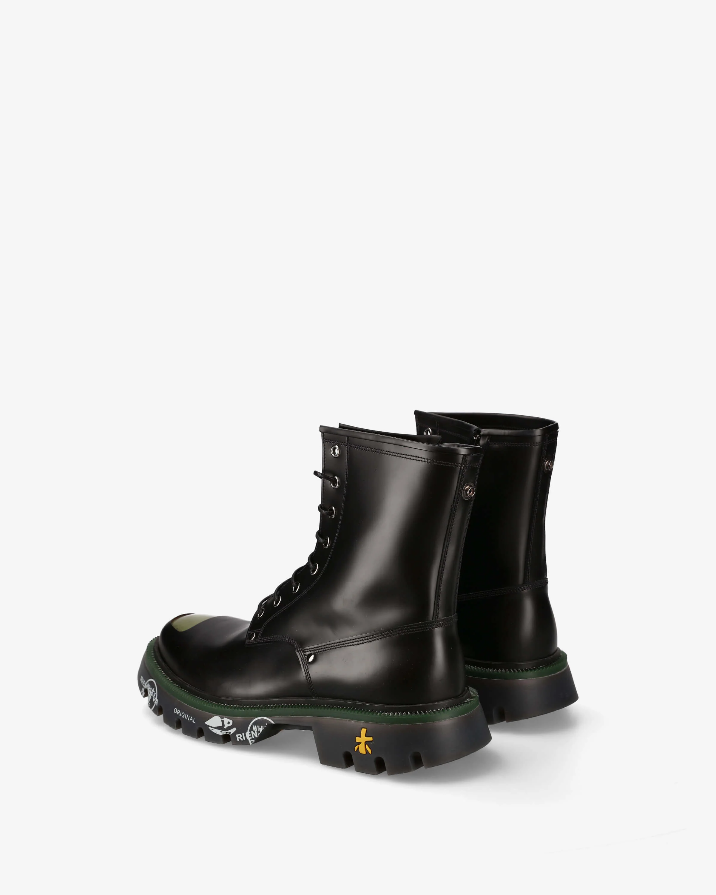 An elevated reinterpretation of the combat boot, the London Green Detail Edition expresses the bold, architectural soul of Premiata design. Crafted from smooth black leather with a lustrous finish, this boot introduces contrasting green elements — a refined nod to industrial precision and urban dynamism. Built for durability and distinction, it features a sculpted rubber sole with the brand’s signature graphic markings, delivering both traction and unmistakable character.