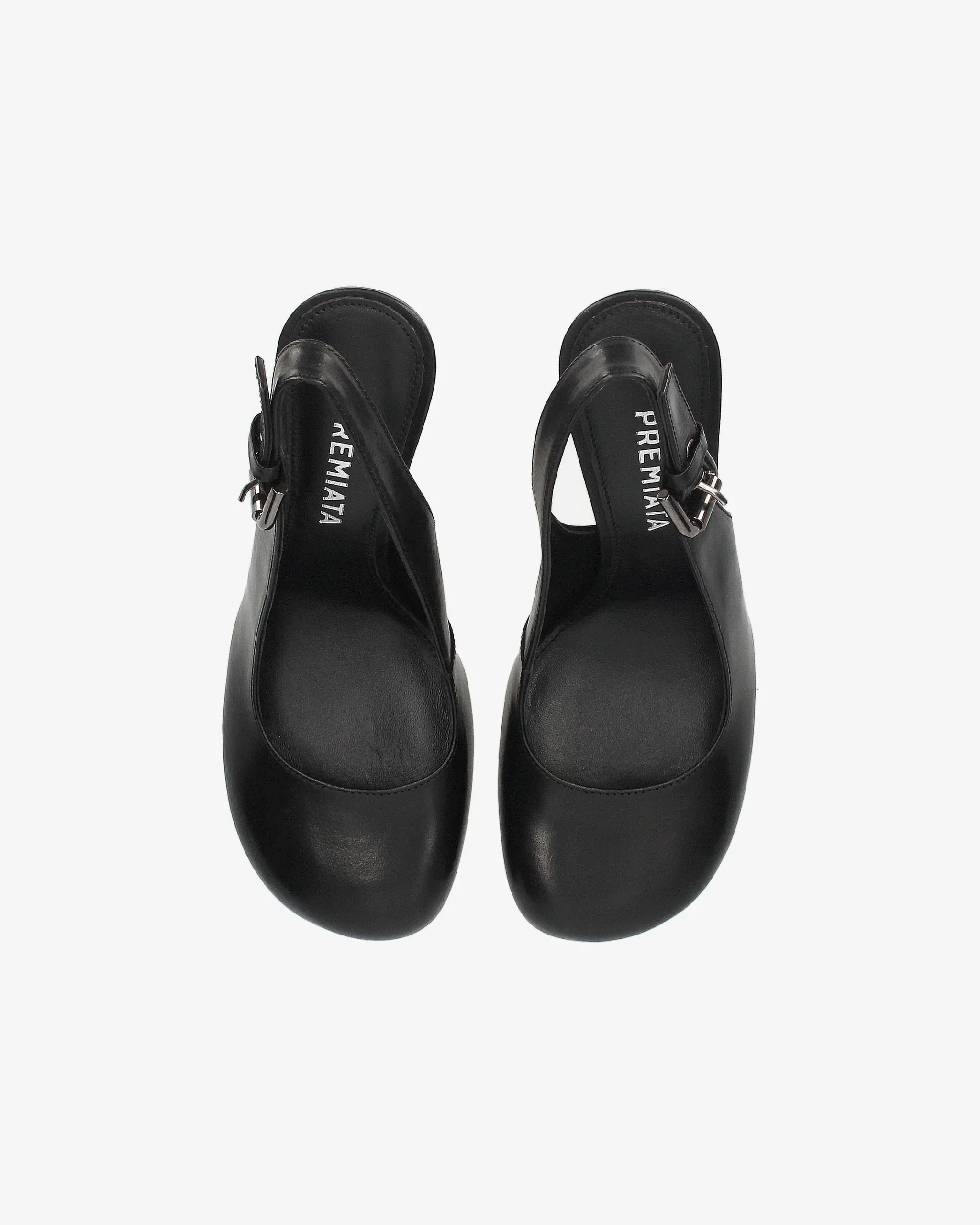 Timeless design with a modern silhouette. This black slingback heel redefines sophistication with its rounded toe, sculptural heel, and adjustable buckle strap. Crafted in premium leather, it's the perfect companion for elevated everyday looks or refined evening moments. Feminine, bold, and undeniably Premiata.